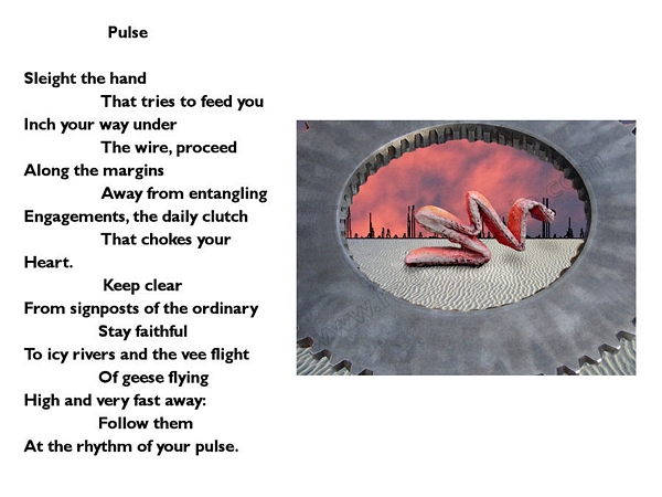 Not all of the poems and artworks match up seamlessly. They are individualized even as they are collaborative: they are both our voices, existing in call and response, the one to the other. But they would not have existed at all but for Scarlet Monahan’s remarkable generosity in creating a connection out of the thin social fabric of cyber-space.